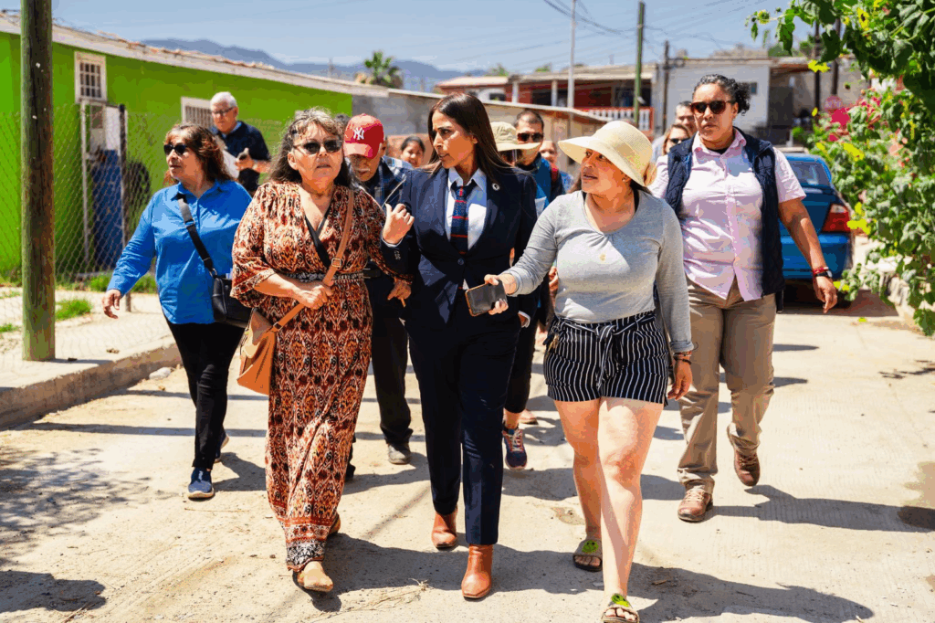 Ensenada, B.C.- Domingo 6 de julio de 2025.- Para supervisar el puente peatonal que construyó su administración, así como otras mejoras efectuadas y atender a residentes, la presidenta municipal Claudia Agatón Muñiz recorrió la colonia Pro Hogar.
