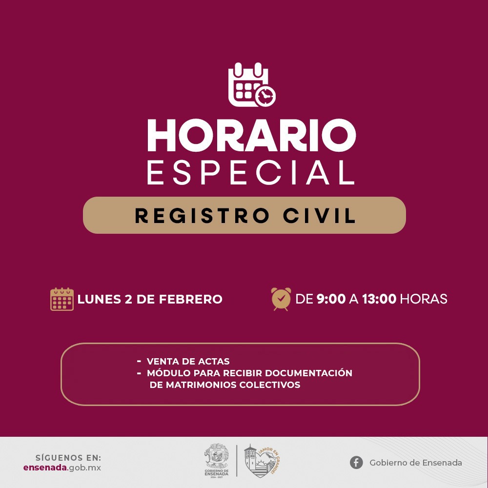El Gobierno de Ensenada informa que esta medida aplica para todo el personal, sin embargo, la oficina del Registro Civil de las 9:00 a las 13:00 horas tendrá guardia para venta de actas y módulo para recibir documentación de matrimonios colectivos 2026.